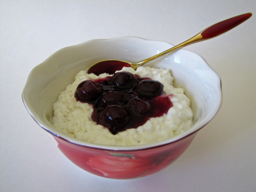 Ris A La Mande Some families start with rice pudding. A whole almond is hidden in the pudding and whoever gets the almond receives the almond present, traditionally but not necessarily a marzipan pig. Afterwards most people have either duck, roast, turkey or goose served with potatoes, gravy, and cooked red cabbage. If you did not start with rice pudding, you have a kind of cold rice pudding for dessert along with cherry sauce and, of course, the whole almond. Christmas beer, a sweet beer with very little alcohol, or juice is served with the porridge and red wine is common with the main course.