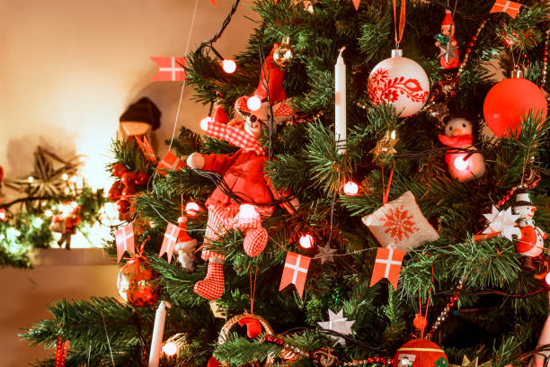 Detail of a Typical Danish Christmas Tree First of all, the Christmas tree came along, decorated with paper decorations, fruit, sweets, candles and small Danish flags. The whole concept of Christmas trees was imported from Germany. Also, Christmas gifts became common along with Christmas cards and the Christmas "nisse," a small Danish mythical creature that you definitely want to stay best friends with, since he is able to control your fortune. Hence the tradition of putting porridge out for the nisse on Christmas Eve. The nisse was usually a small, old man with a white beard, dressed in a grey sweater, grey trousers, a red pixie cap, red stockings and wooden shoes. He was believed to live hundreds of years. As Christmas today is a family time, also the nisse has a family now.